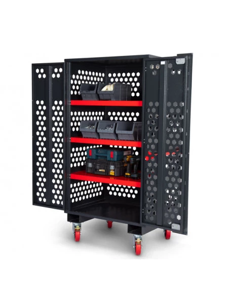• Des bacs de rangement en plastique résistant optionnels permettent d’organiser les contenus tout en restant visibles à tout moment pour une identification facile. Les passages de fourche sont intégrés pour faciliter le transport.