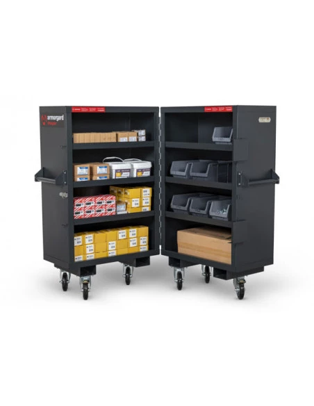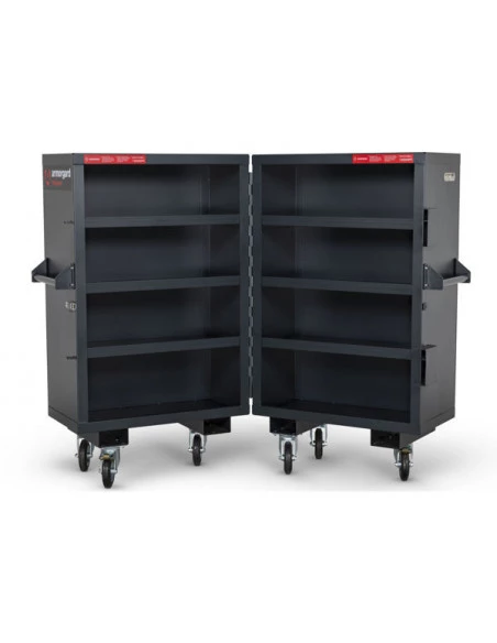 • 2 loquets avec fermeture cadenas, 6 roulettes (2 freinés) et 6 étagères soudées.