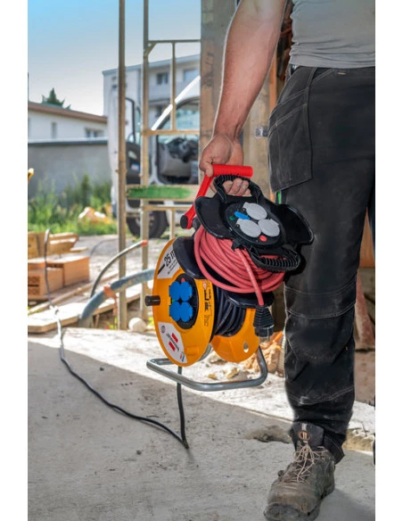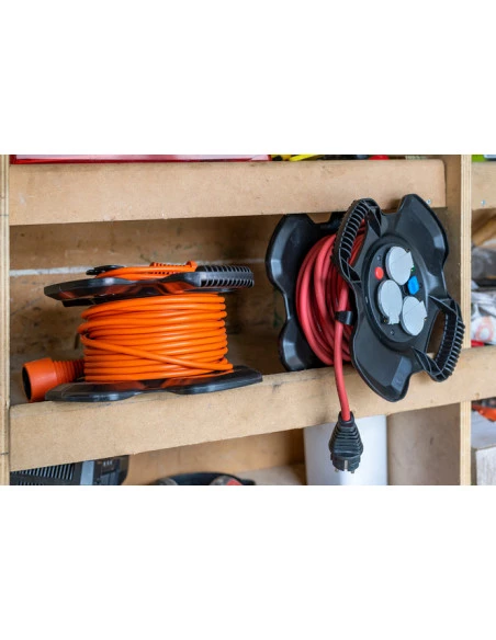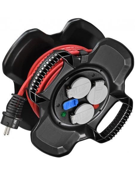 • Enrouleur avec support en plastique/caoutchouc, 3 prises avec clapets à fermeture automatique, voyant de présence de tension LED, 2 prises USB avec capuchon et disjoncteur thermique